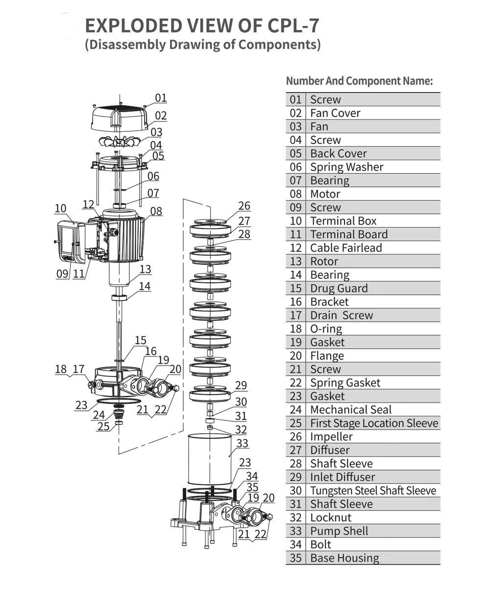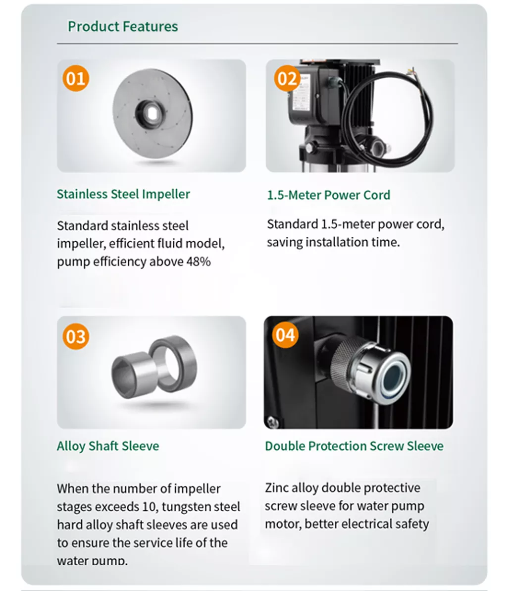 Głowicę pompy można regulować, zmieniając liczbę wirników, aby spełnić różne wymagania. Nadaje się do czystej wody lub cieczy o podobnych właściwościach, a niektóre modele można dostosować do mediów korozyjnych.